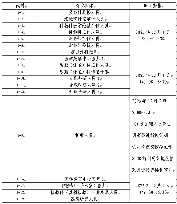 (二)根據(jù)《廣州市衛(wèi)生健康委員會(huì)直屬事業(yè)單位廣州市皮膚病醫(yī)院2025年第一次公開招聘公告》,護(hù)理崗位面試含技能測(cè)試。護(hù)理崗位技能測(cè)試時(shí)間為2025年12月2日資格復(fù)審當(dāng)天9:30,請(qǐng)?jiān)搷徫豢忌?/span>攜帶有效期內(nèi)二代居民身份證,于8:30前到復(fù)審地點(diǎn)簽到并進(jìn)行資格復(fù)審,未能按時(shí)簽到參加資格復(fù)審的或復(fù)審不符合條件資格的,取消參加技能測(cè)試資格。
