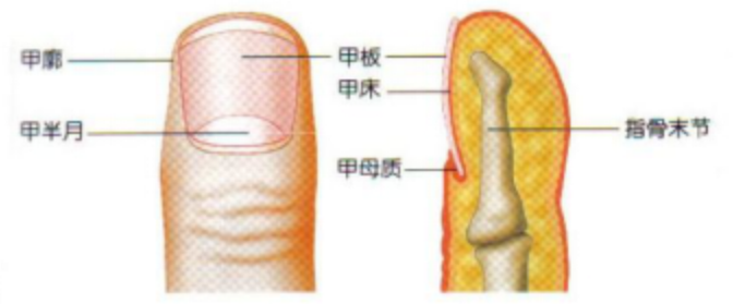 我們平?吹街讣捉凶觥凹装濉,甲板下面是“甲床”,甲板上的半月形粉紅色白色結構是“甲半月”,指甲和皮膚交界的下方大約0.5cm下就是指甲生長的“土地”——“甲母質(zhì)”(圖中黑色框內(nèi))。了解這個非常重要,有一些甲的改變外用藥膏需要涂抹在“甲母質(zhì)”上,僅僅涂抹在“甲板”上療效不佳。