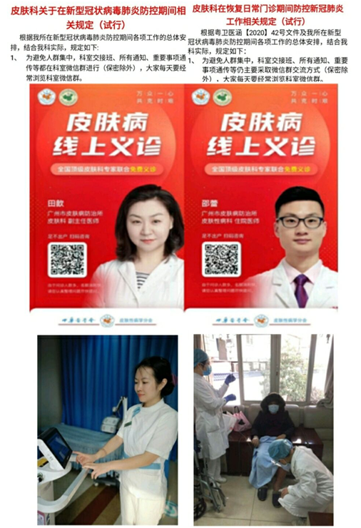 在科室領(lǐng)導(dǎo)們帶領(lǐng)下,醫(yī)生護(hù)士們積極配合,在各自崗位用各自方式為抗疫出力,田歆、邵雷兩位醫(yī)生,積極響應(yīng)中華醫(yī)學(xué)會(huì)皮膚科分會(huì)倡議:在春節(jié)期間和節(jié)后各單位皮膚科還沒(méi)全面開診期間,網(wǎng)上義務(wù)為皮膚病患者義診、咨詢,解決了病人無(wú)法來(lái)醫(yī)院就診的困難。臨床一支部黨員群眾在接到衛(wèi)健委要組建三人小組入戶調(diào)查和自愿捐款的通知后,都爭(zhēng)先恐后報(bào)名和捐款,大家都希望能在這次抗擊新冠肺炎疫情大戰(zhàn)中盡綿薄之力。