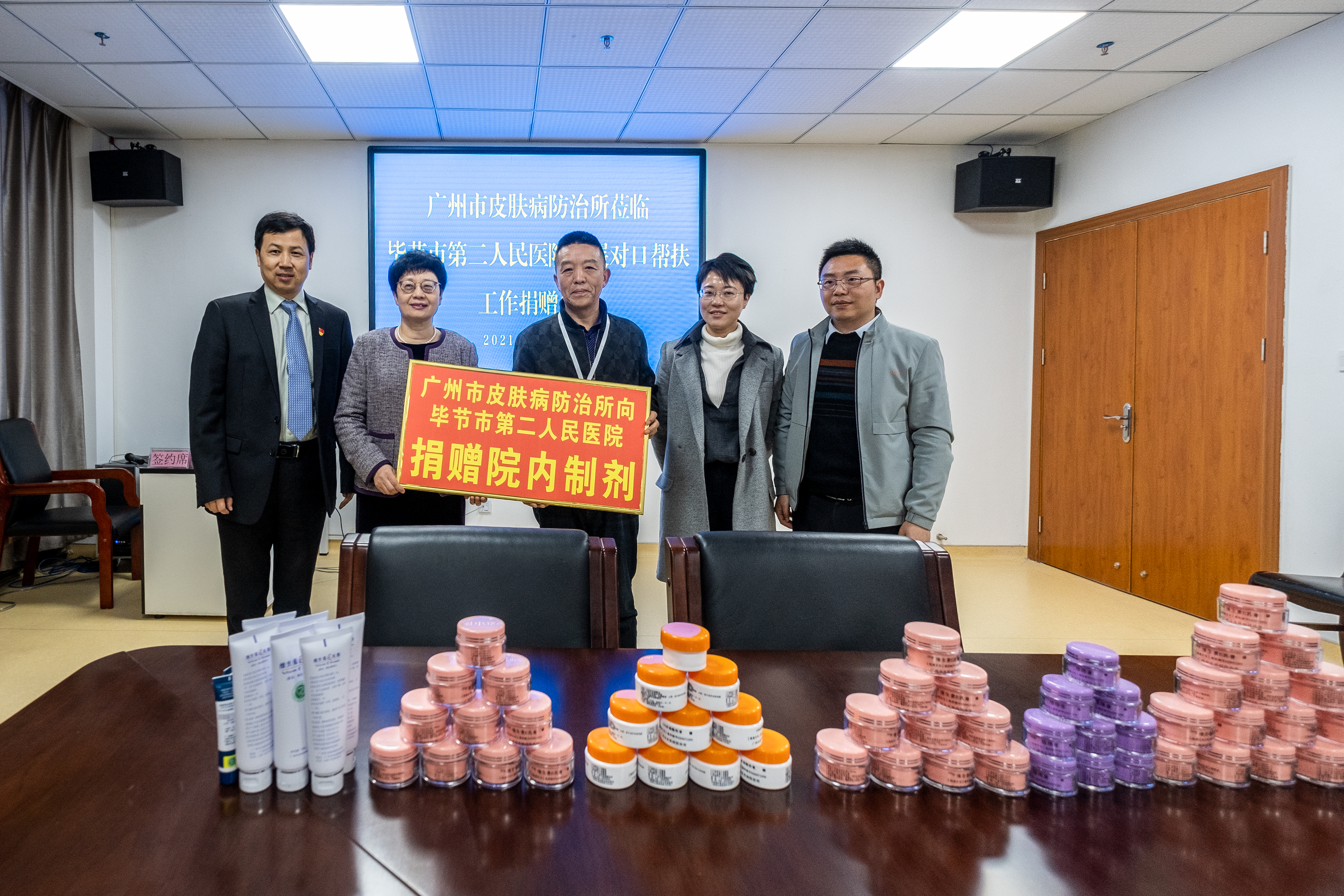 座談會后,進行了所內(nèi)制劑捐贈及幫扶協(xié)議繼簽儀式,王建琴所長代表廣州市皮膚病防治所給畢節(jié)市第二人民醫(yī)院贈送了一批所內(nèi)制劑,并與醫(yī)院代表王剛院長簽訂了新一輪的幫扶協(xié)議。