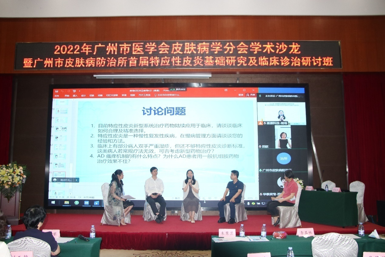 會議還設(shè)置了討論環(huán)節(jié),在廣州市皮膚病防治所醫(yī)務(wù)科科長黃茂芳教授、激光理療科主任龔業(yè)青教授的主持下,廣州醫(yī)科大學(xué)附屬第二醫(yī)院皮膚科主任楊文林教授、廣州市皮膚病防治所門診部副主任李潤祥教授、皮膚病防治科副主任田歆教授、住院病房副主任羅育武教授分別就如何在臨床上合理、精準(zhǔn)選擇特應(yīng)性皮炎新型系統(tǒng)治療藥物;如何對特應(yīng)性皮炎病人進(jìn)行慢病管理;對于嚴(yán)重濕疹如何選擇新型藥物治療以及對于傳統(tǒng)抗組胺藥物治療不佳且伴嚴(yán)重瘙癢AD 患者的瘙癢治療和管理等進(jìn)行了熱烈討論,觀點碰撞、各抒己見,使參與討論者和傾聽者都收獲良多。