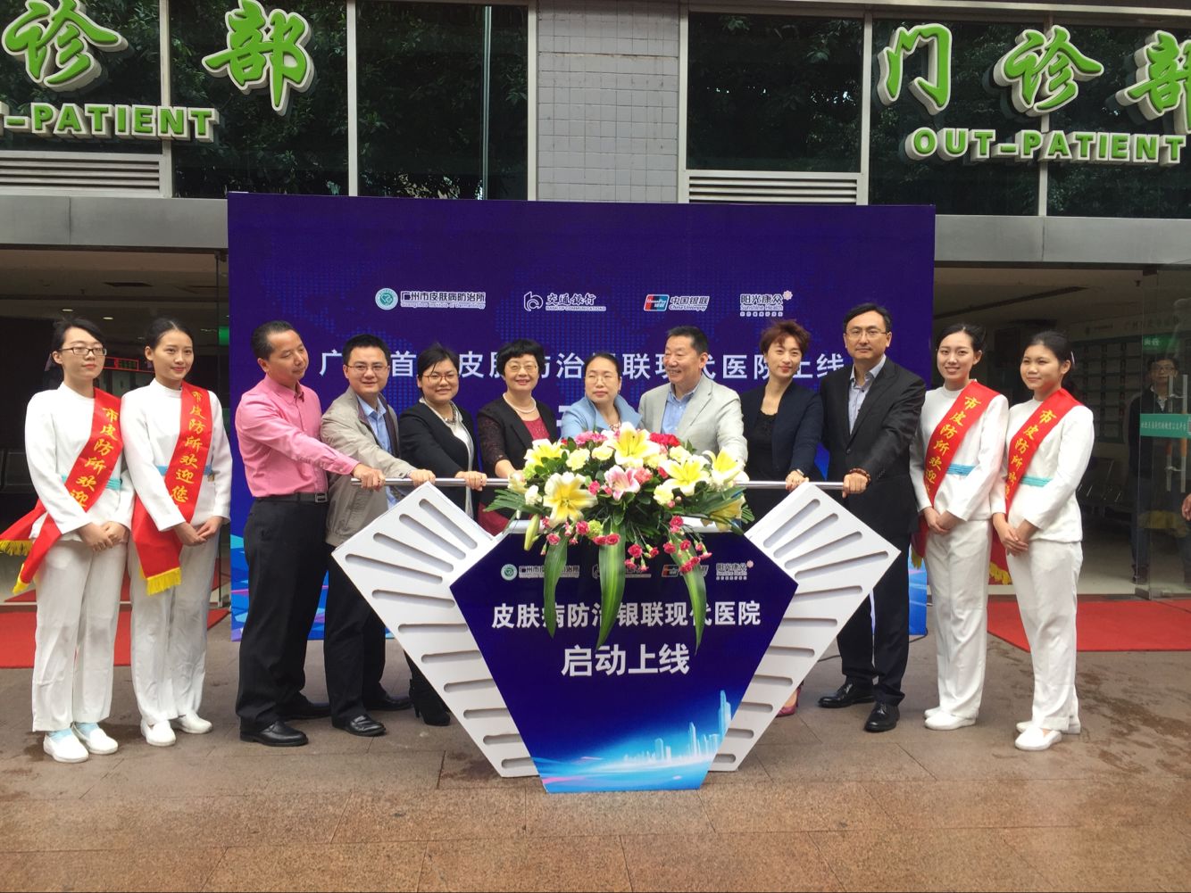 在銀聯(lián)現(xiàn)代醫(yī)院上線啟動(dòng)會(huì)的最后,廣州市衛(wèi)計(jì)委信息統(tǒng)計(jì)處匡艷陽副處長、廣州市皮防所所長王建琴、黨委書記張錫寶、副所長葉興東、中國銀聯(lián)廣東分公司創(chuàng)新推廣部副總經(jīng)理練恒光、交通銀行廣東分行信息技術(shù)部總經(jīng)理?xiàng)盍⑽摹⒅协h(huán)支行行長謝婭婷以及陽光康眾CEO遠(yuǎn)志一起推動(dòng)拉桿,標(biāo)志著廣東首家皮膚病防治銀聯(lián)現(xiàn)代醫(yī)院正式在我所啟動(dòng)上線。