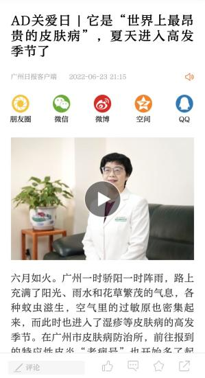 6月17日廣州日報《名醫(yī)專訪》欄目對我所王建琴所長進行關(guān)于特應(yīng)性皮炎的病因、臨床表現(xiàn)及防治管理專題采訪,王建琴所長對“濕疹和AD的關(guān)系”、“不同年紀AD 的表現(xiàn)”、“激素恐懼癥”以及“如何進行AD 的長期管理”等老百姓關(guān)心的問題進行解答,隨后廣州日報在報紙和廣州日報App上分別發(fā)表AD防治科普文章和推出專訪視頻,反響熱烈,其中視頻點擊播放量達31萬人次。