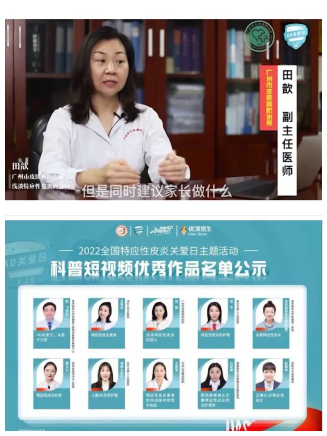皮膚病防治科田歆副主任制作的科普視頻“特應(yīng)性皮炎不能吃什么”參加了今年“6.26AD關(guān)愛日”活動的科普短視頻大賽,經(jīng)過組委會專家的綜合評審,田教授的視頻被評選為“科普短視頻優(yōu)秀作品”。通過短視頻這種動態(tài)科普方式,更好地加強大眾科學(xué)認識AD。