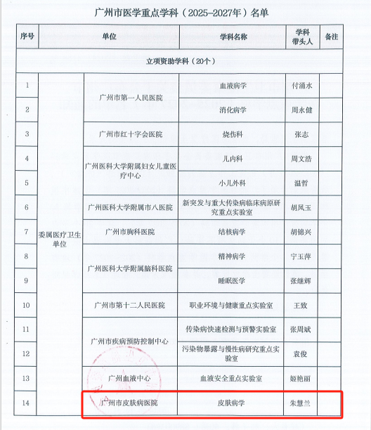 根據(jù)《廣州市衛(wèi)生健康委員會關(guān)于公布廣州醫(yī)學(xué)重點(diǎn)學(xué)科(2025-2027年)名單的通知》,我院皮膚病學(xué)、皮膚病學(xué)與性病學(xué)診斷重點(diǎn)實(shí)驗(yàn)室獲批廣州市醫(yī)學(xué)重點(diǎn)學(xué)科(2025-2027年),重點(diǎn)學(xué)科建設(shè)工作實(shí)現(xiàn)新的突破。