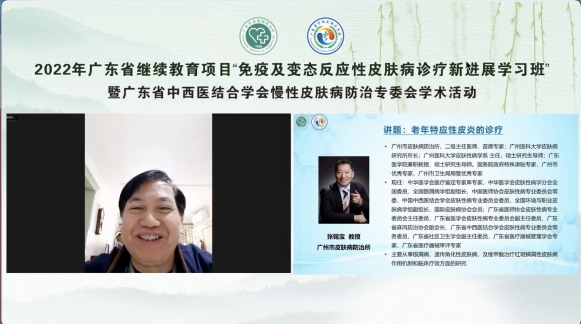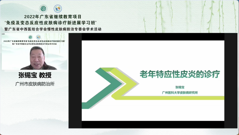 廣州市皮膚病防治所首席專家張錫寶教授為學員們帶來了《老年特應性皮炎的診療》講座。老年特應性皮炎是近年備受關注的一類疾病,張錫寶教授聲情并茂地給大家展示了老年特應性皮炎的臨床特點、鑒別診斷等,并且強調了老年人群的特殊性,在治療方面需要更加注重安全性,為大家在遇到老年患者時提供了更加開闊的診療方向和思路。