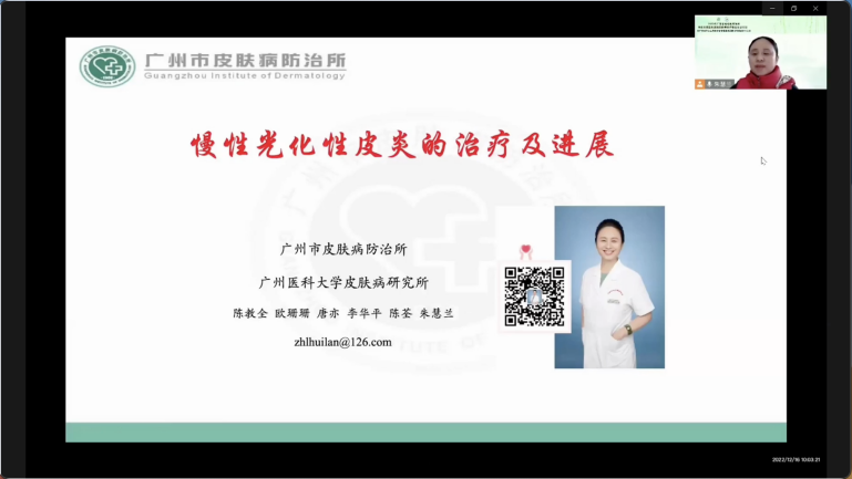 廣州市皮膚病防治所黨委書記、廣州醫(yī)科大學皮膚病研究所副所長朱慧蘭教授分享了《慢性光化性皮炎的治療及進展》。講座中朱教授從慢性光化性皮炎的定義、發(fā)病機制、臨床表現(xiàn)、治療及預防等多方面介紹了該病,隨后結合臨床病例,圖文并茂地向學員展示了傳統(tǒng)及新型治療方案的療效及安全性,為學員在治療慢性光化性皮炎上提供了更多的選擇。