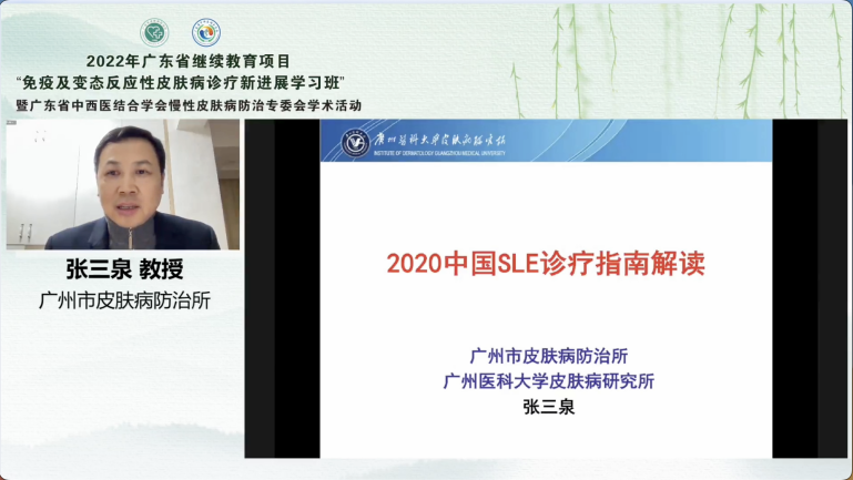 廣州市皮膚病防治所副所長張三泉教授為學員們帶來了《2020版中國系統(tǒng)性紅斑狼瘡診療指南解讀》。張教授基于近年來中國的臨床數(shù)據(jù),通過對中國新版系統(tǒng)性紅斑狼瘡診療指南的解讀,帶著學員們回顧了該病的臨床癥狀、診斷標準以及治療原則,提倡早期、個體化的治療,最大程度延緩疾病進展,改善預后。