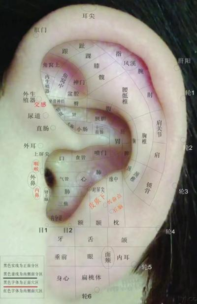 從中醫(yī)角度來(lái)看,耳廓外形的排列好像一個(gè)在子宮內(nèi)倒置的胎兒,按照這樣的規(guī)律,人體的五臟六腑,四肢百骸,五官七竅,甚至更小的部位,在耳廓都有相應(yīng)區(qū)域,這些對(duì)應(yīng)的反射區(qū)我們也叫耳穴。