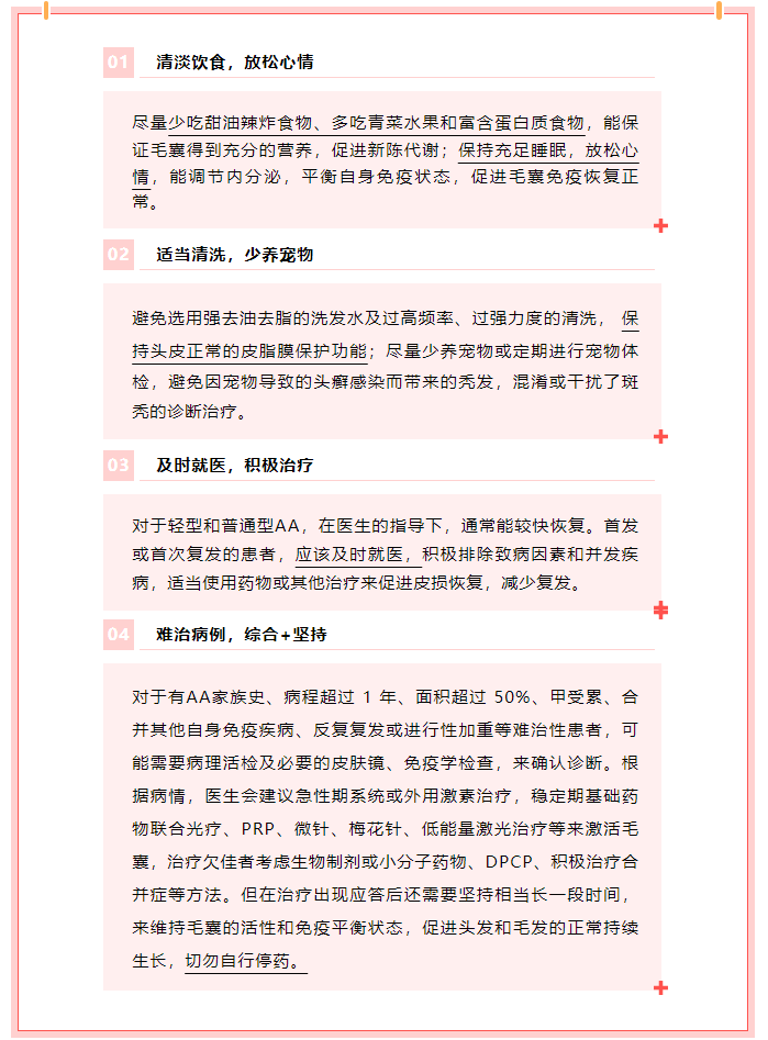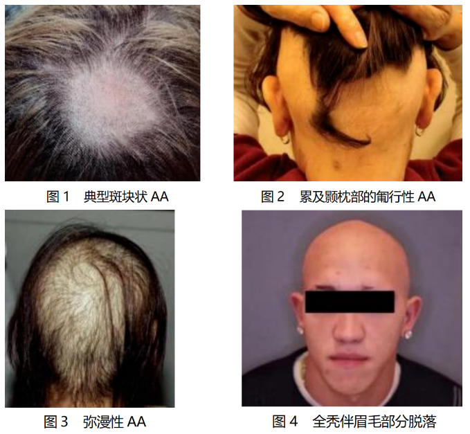 老百姓口中的“禿發(fā)、鬼剃頭”,醫(yī)學(xué)上稱為“斑禿(alopecia are ata , AA)”,是一種常見的自身免疫性、非瘢痕性脫發(fā), 被列為臨床第二常 見的脫發(fā)類型。斑禿按禿發(fā)形態(tài)可分為斑片型、網(wǎng)狀型、匐行性、彌漫型等眾多類型, 高發(fā)年齡為 20~40 歲, 無性別差異。