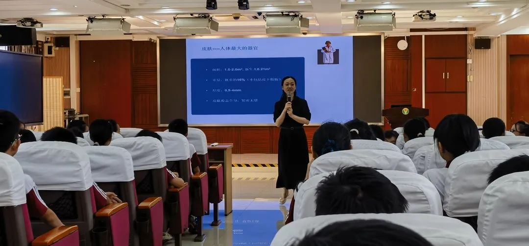 皮膚健康知識科普講座上,我院梁碧華主任用生動有趣、通俗易懂的語言結(jié)合豐富的圖片和動漫,向?qū)W生們講述了皮膚的基本構(gòu)造、功能、常見皮膚病癥狀以及日常皮膚護理的基本知識。學(xué)生們聽得津津有味,現(xiàn)場踴躍舉手回答問題,互動氣氛十分活躍。