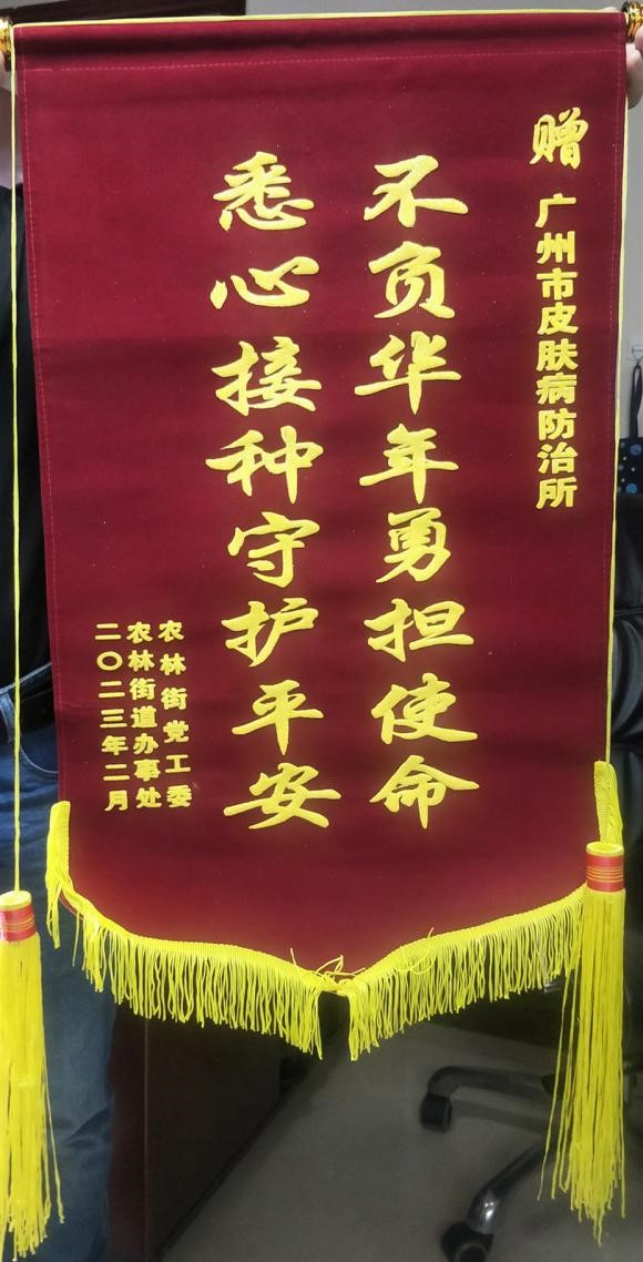 2023年2月17日下午,受廣州市越秀區(qū)農(nóng)林街黨工委和街道辦事處邀請,廣州市皮膚病防治所派代表參加了“農(nóng)林街新冠病毒疫苗接種工作座談會”,并獲頒印有“不負(fù)華年勇?lián)姑,悉心接種守護(hù)平安”的錦旗一面。