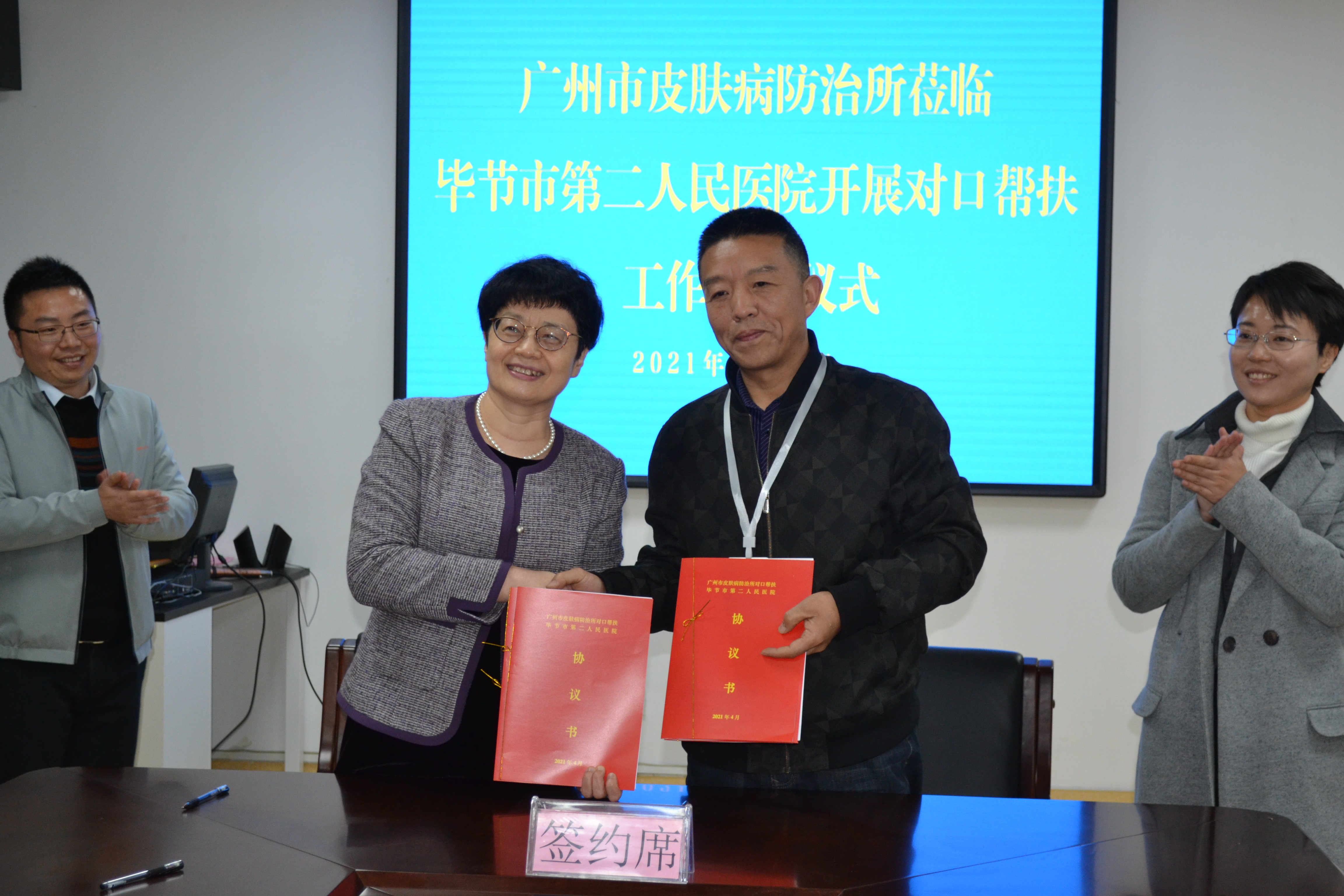 隨后在新院區(qū)會議室舉行了幫扶工作交流座談暨協(xié)議簽署會。會議由陳荃副院長主持,首先王剛院長介紹了畢節(jié)市第二人民醫(yī)院新院址交付使用后1年余的時間,業(yè)務(wù)實現(xiàn)飛躍式的發(fā)展。在廣州醫(yī)院的技術(shù)幫扶下,重癥救治水平得到極大的提高,皮膚科開展了多項新技術(shù)新項目,皮膚病診療水平得到明顯的提升。希望在廣州專家的帶動下,推動業(yè)務(wù)、科研、教學(xué)的不斷進步,并探索新的合作模式,尋求共贏發(fā)展。隨后,王建琴所長祝賀畢節(jié)市第二人民醫(yī)院所取得的亮眼業(yè)績,并表示我所非常重視幫扶工作,領(lǐng)導(dǎo)班子成員均先后來過畢節(jié)進行調(diào)研工作,我所將一如既往的開展幫扶工作,促進該院皮膚科的進一步發(fā)展。我所先后選派了2名政治覺悟高,業(yè)務(wù)能力強的李潤祥主任醫(yī)師、陳荃副主任醫(yī)師駐點開展幫扶工作,收到明顯的成效。廣東省第一扶貧工作組畢節(jié)組綜合部左志鵬部長在會議中指出:廣州市皮膚病防治所一貫支持畢節(jié)市第二人民醫(yī)院醫(yī)療技術(shù)的提升,感謝我所在業(yè)務(wù)、科研、教學(xué)方面所做的幫扶工作,我所派出精銳骨干的出色表現(xiàn)得到了廣東省政府的肯定。會議中雙方領(lǐng)導(dǎo)及醫(yī)療骨干就如何更好的開展醫(yī)療幫扶工作,促進畢節(jié)市第二人民醫(yī)院重點?频慕ㄔO(shè)進行了熱烈的交流。最后王剛院長對幫扶座談會進行總結(jié),再次感謝廣州市皮防所的義舉,全院要繼續(xù)創(chuàng)建重點學(xué)科。