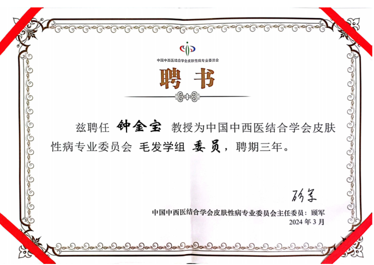 2024年3月,我院鐘金寶主任醫(yī)師被聘為中國中西醫(yī)結(jié)合學(xué)會(huì)皮膚性病專業(yè)委員會(huì)毛發(fā)學(xué)組委員。