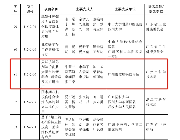 近期,廣東省人民政府公布2022年度廣東省科學(xué)技術(shù)獎(jiǎng)獲獎(jiǎng)名單,廣州市皮膚病防治所朱慧蘭教授作為第一完成人的項(xiàng)目《天然抗氧化劑防護(hù)皮膚光損傷的新靶點(diǎn)、新策略及其應(yīng)用推廣》榮獲廣東省科技進(jìn)步獎(jiǎng)二等獎(jiǎng)!