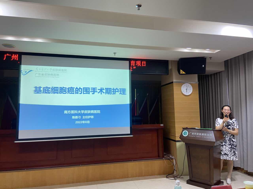南方醫(yī)科大學(xué)皮膚病醫(yī)院護(hù)理部主任陳慕刁向在場(chǎng)的護(hù)理人員講授《基底細(xì)胞癌的圍手術(shù)期護(hù)理》。陳主任從基礎(chǔ)概念進(jìn)行普及,結(jié)合臨床實(shí)例介紹治療的方案,深入淺出地講述基底細(xì)胞癌術(shù)后護(hù)理的注意事項(xiàng),全面提高了學(xué)員們對(duì)基底細(xì)胞癌圍手術(shù)期的護(hù)理能力。