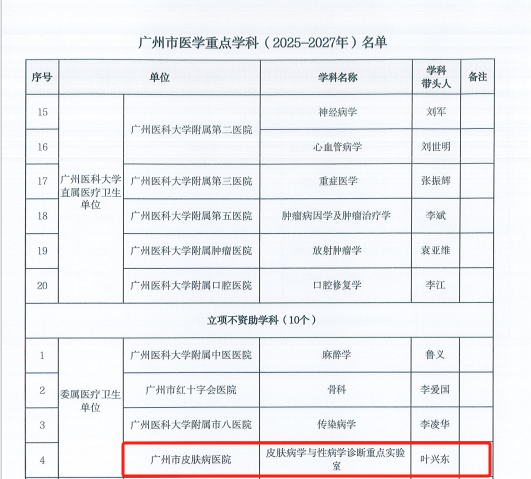 根據(jù)《廣州市衛(wèi)生健康委員會關(guān)于公布廣州醫(yī)學(xué)重點(diǎn)學(xué)科(2025-2027年)名單的通知》,我院皮膚病學(xué)、皮膚病學(xué)與性病學(xué)診斷重點(diǎn)實(shí)驗(yàn)室獲批廣州市醫(yī)學(xué)重點(diǎn)學(xué)科(2025-2027年),重點(diǎn)學(xué)科建設(shè)工作實(shí)現(xiàn)新的突破。