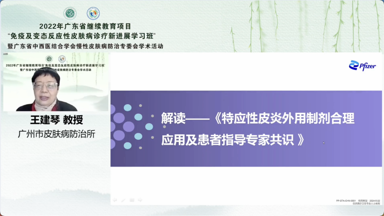 廣州市皮膚病防治所主任醫(yī)師王建琴教授針對《特應性皮炎外用制劑合理應用及患者指導專家共識》進行了解讀,由淺入深地為學員系統(tǒng)地回顧了皮膚科外用制劑的使用原則,針對各類特應性皮炎外用制劑進行了療效方面及安全性的全方位講解,為學員在特應性皮炎的外用藥物選擇上提供了有效指導。