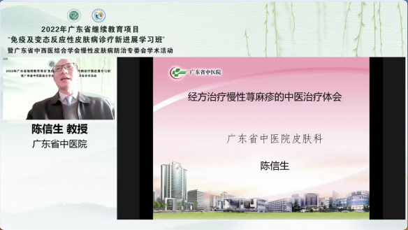 廣東省中醫(yī)院皮膚科主任、廣東省中西醫(yī)結合學會慢性皮膚病防治專委會副主委陳信生教授為我們講解了《經(jīng)方治療慢性病蕁麻疹的中醫(yī)治療體會》。慢性蕁麻疹是一種常見的變態(tài)反應性皮膚病,通過陳教授的講座學員們了解到,除了目前傳統(tǒng)的抗過敏治療外,中醫(yī)經(jīng)方治療亦可以對慢性蕁麻疹起到理想療效。