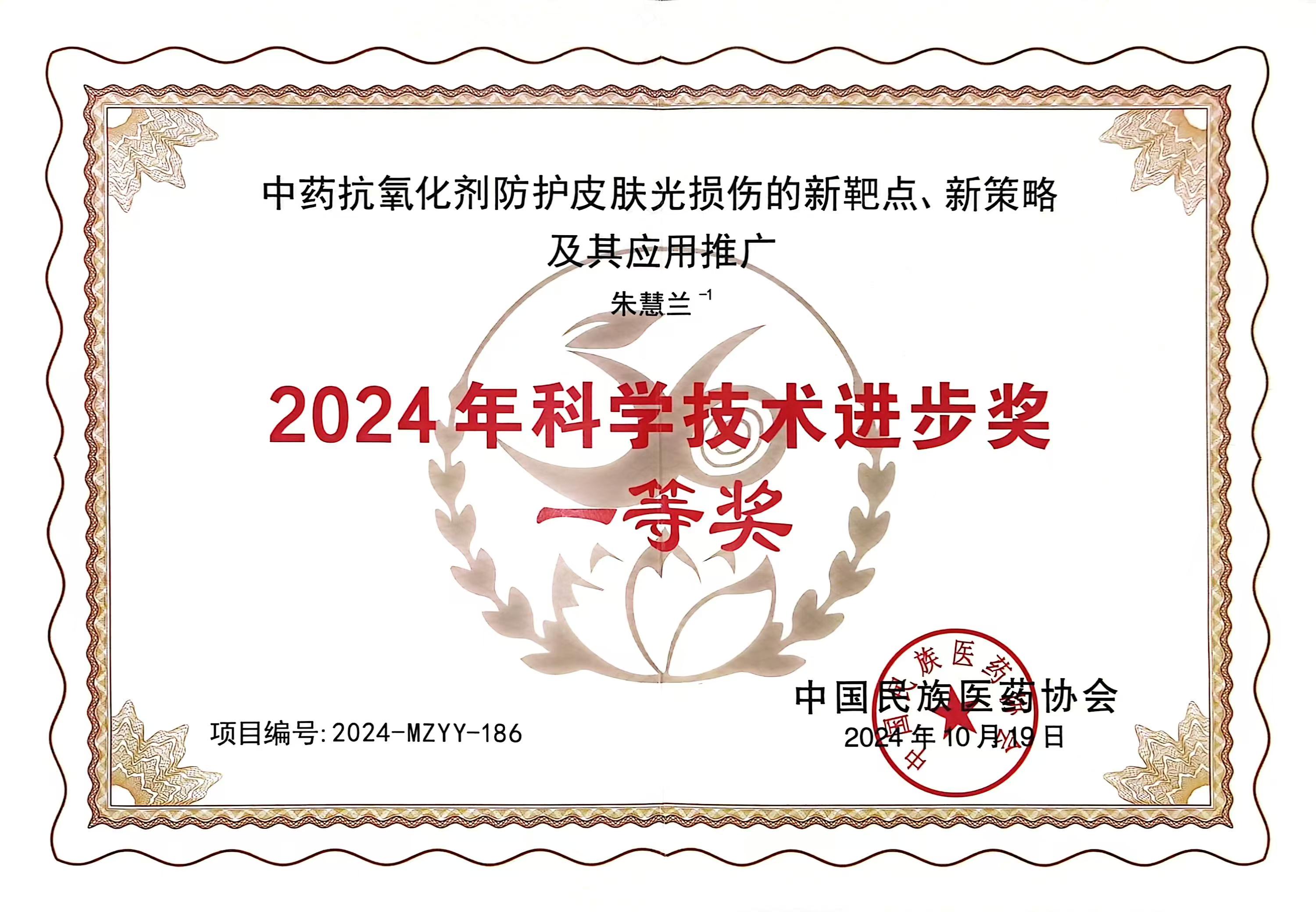 2024年10月19日,“中國(guó)民族醫(yī)藥協(xié)會(huì)科學(xué)技術(shù)獎(jiǎng)?lì)C獎(jiǎng)大會(huì)暨院士、國(guó)醫(yī)大師學(xué)術(shù)交流大會(huì)”在北京隆重召開(kāi)。我院黨委書記朱慧蘭教授、化妝品檢測(cè)中心負(fù)責(zé)人李華平博士參加了本次會(huì)議。朱慧蘭教授領(lǐng)銜的項(xiàng)目“中藥抗氧化劑防護(hù)皮膚光損傷的新靶點(diǎn)、新策略及其應(yīng)用推廣”榮獲2024年中國(guó)民族醫(yī)藥協(xié)會(huì)科學(xué)技術(shù)進(jìn)步獎(jiǎng)一等獎(jiǎng)。